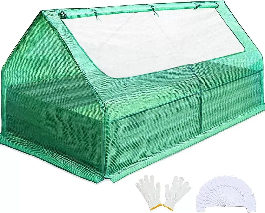 6x3x1ft Galvanized Raised Garden Bed with Cover Metal Planter Box Kit, w/ 2 Large Screen Windows Mini Greenhouse 20pcs T Tags 1 Pair of Gloves Included Outdoor Growing Vegetables